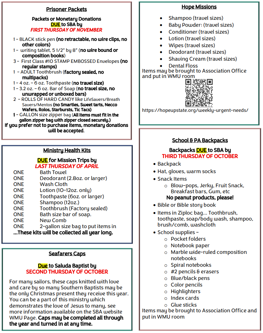 We are a mission partner/arm of the Saluda Baptist Association. We are also affiliated with the South Carolina Baptist Convention WMU, as well as the National WMU. We join our hearts and hands to engage women of all ages in mission education and mission involvement.
